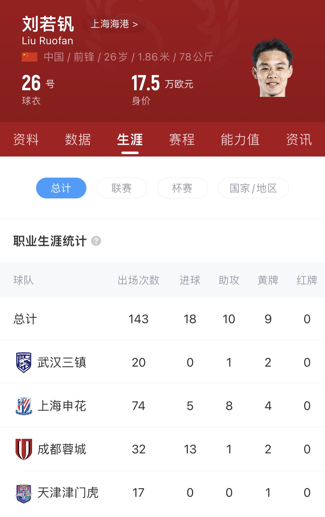 刘若钒曾为申花效力5个赛季,在2017足协杯决赛有过精彩表现,18岁荣膺“中国金童奖”。