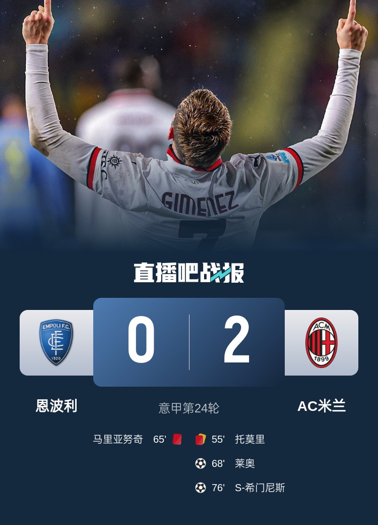 米兰本轮2-0击败恩波利,双方在下半场都被罚下一人,最终米兰凭借莱奥和新援S-希门尼斯的进球拿下胜利。