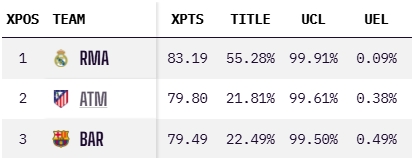 机构目前预测本赛季最终皇马积分将达到83分,马竞和巴萨均为79分。
