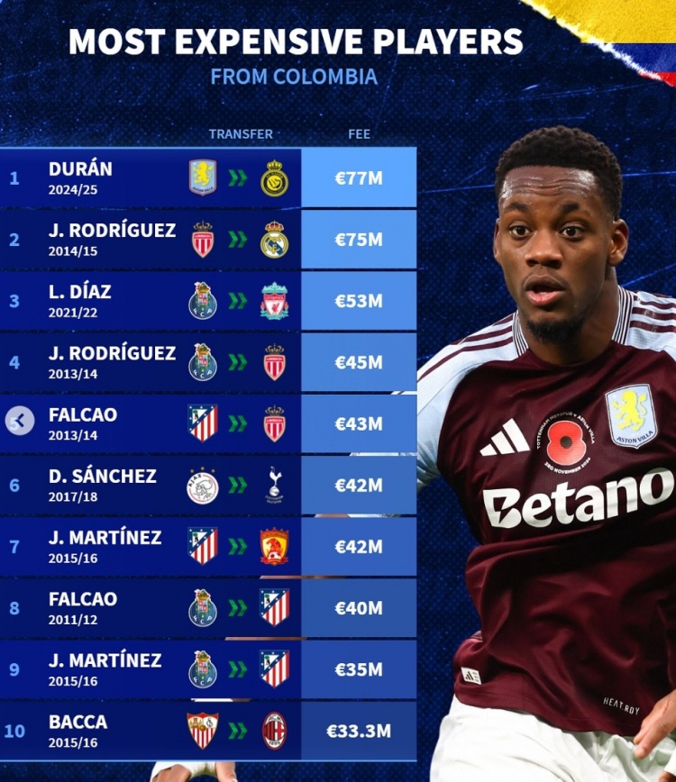 德转列哥伦比亚球员转会费榜:杜兰破J罗纪录,恒大4200万签J马 2月1日讯 利雅得胜利已经官宣7700万欧基础转会费签下维拉前锋杜兰,数据统计显示这也打破了哥伦比亚籍球员的历史转会费纪录。德转列哥伦比亚球员转会费榜:欧元1.杜兰,维拉→利雅得胜利,24-25赛季, 2025/02/01