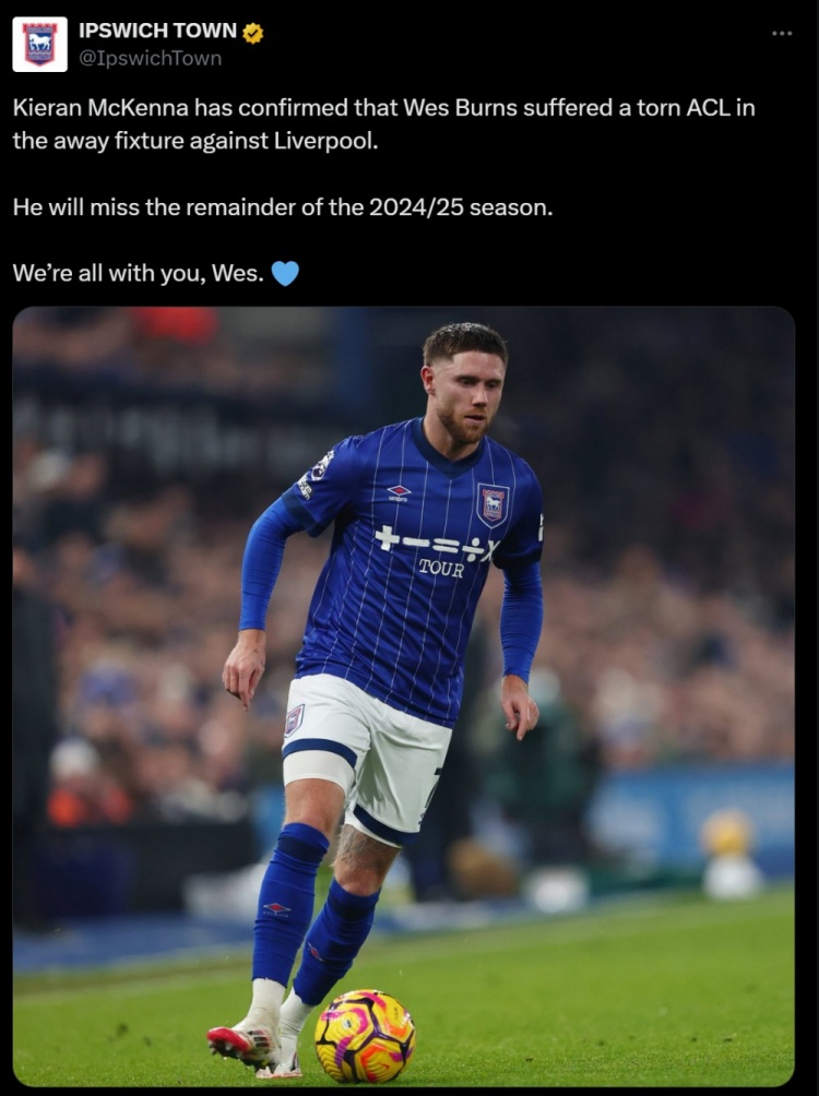 官方:伊镇前锋伯恩斯客战利物浦时十字韧带撕裂,赛季提前报销 1月31日讯 英超第23轮比赛中,伊普斯维奇1-4不敌利物浦,伯恩斯开场29分钟受伤。伊普斯维奇官方确认,伯恩斯遭遇重伤,赛季提前报销。伊普斯维奇表示,伯恩斯在客战利物浦的比赛中十字韧带撕裂,他将缺席 2025/02/01