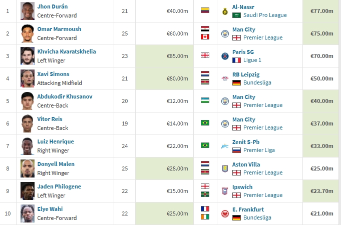 还会有惊喜吗?冬窗转会费排行:杜兰7700万欧领跑 前十曼城占3人 02月01日讯 利雅得胜利官宣签下杜兰,杜兰也以7700万欧暂时成为今年冬窗标王,前十曼城有3人入选。2025冬窗转会费排行:(浮动部分未计入)1.杜兰:7700万欧,维拉→利雅得胜利2.马尔穆什:7 2025/02/01