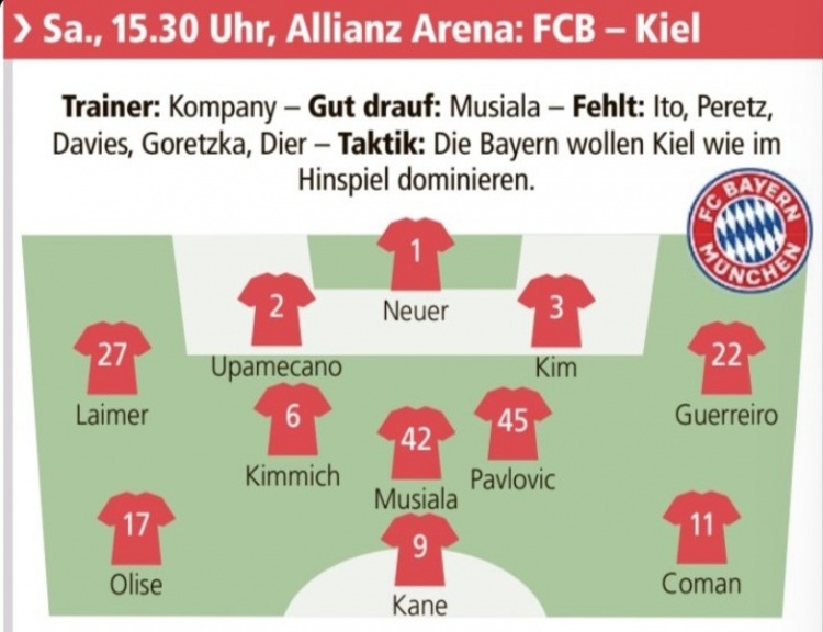 德媒预测拜仁首发:莱默尔、格雷罗左右边后卫,基米希回归中场 2月1日讯 拜仁将在本轮德甲对阵基尔,《慕尼黑日报》预测了拜仁首发情况,基米希预计回归中场。预测拜仁首发:门将:诺伊尔后卫:莱默尔、于帕梅卡诺、金玟哉、格雷罗中场:基米希、穆西亚拉、帕夫洛维奇前锋:奥 2025/02/01